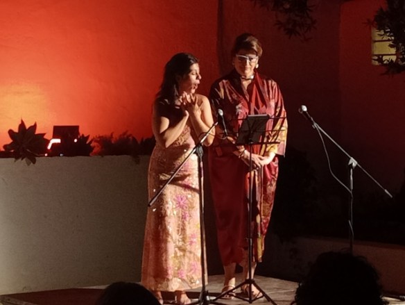 Todo está dispuesto. Las personas colaboradoras del acontecimiento van y vienen trajinando los últimos detalles mientras el respetable, puntual, hace su entrada al espacio del recital. Un programa ágil y variado, con guiños a la cultura andaluza y argárica y temas de proyección universal. También la zarzuela. Empezamos con dos temas de Richard Strauss mano a mano entre las dos intérpretes. Seguirá el concierto con “Tu pupila azul”, de Joaquín Turina, en la voz joven, afinada y versátil de Patricia Calvache y, seguido, la réplica de Ana Häsler con la composición de Antonio García Abril de la Elegía a la pérdida de la Alhambra de Canciones del jardín secreto, un canto en árabe, triste y doloroso, en el cual Boabdil, último rey musulmán del reino de Granada, llora el quebranto del enclave mágico de la Alhambra y sus jardines. El pianista y compositor Miquel Ortega entrará en el juego interpretativo sonoro del concierto para regalar a la noche el tema En la Alhambra del maestro Isaac Albéniz.
