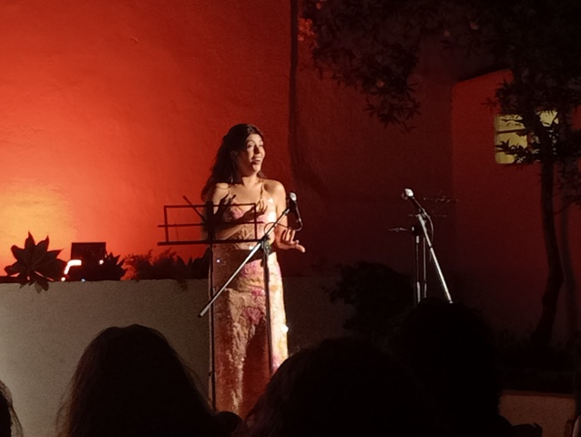 Todo está dispuesto. Las personas colaboradoras del acontecimiento van y vienen trajinando los últimos detalles mientras el respetable, puntual, hace su entrada al espacio del recital. Un programa ágil y variado, con guiños a la cultura andaluza y argárica y temas de proyección universal. También la zarzuela. Empezamos con dos temas de Richard Strauss mano a mano entre las dos intérpretes. Seguirá el concierto con “Tu pupila azul”, de Joaquín Turina, en la voz joven, afinada y versátil de Patricia Calvache y, seguido, la réplica de Ana Häsler con la composición de Antonio García Abril de la Elegía a la pérdida de la Alhambra de Canciones del jardín secreto, un canto en árabe, triste y doloroso, en el cual Boabdil, último rey musulmán del reino de Granada, llora el quebranto del enclave mágico de la Alhambra y sus jardines. El pianista y compositor Miquel Ortega entrará en el juego interpretativo sonoro del concierto para regalar a la noche el tema En la Alhambra del maestro Isaac Albéniz.