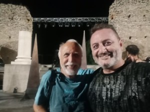 Pues bien, en esta ocasión, volviendo a vivir la tragedia de W. Shakespeare, que escribió basándose en la historia de Tomás Moro sobre la guerra civil inglesa, la Guerra de las Dos Rosas, y haciéndolo en el marco privilegiado de Clunia, tuve la suerte –además- de poder felicitar y saludar personalmente a Jerónimo Arenal, felicitaciones y saludo extensos a toda la compañía y a Ricardo Iniesta, presente en la representación. Unas pocas palabras, un estrechón de manos y un par de fotos, bastaron. Para mí fue el colofón ideal a una velada teatral perfecta. El ritmo, la impecable vocalización, la interpretación pulcra y acertada de un texto complejo, la iluminación, la música, la dirección y el complicado montaje, todo, fluyó con la naturalidad y el dramatismo requerido. La veintena de personajes de la trama dramática fueron puestos sobre las tablas por los nueve intérpretes, cinco hombres y cuatro mujeres, con un rigor y una profesionalidad capaces de contagiar en cada escena la magia pura del teatro.