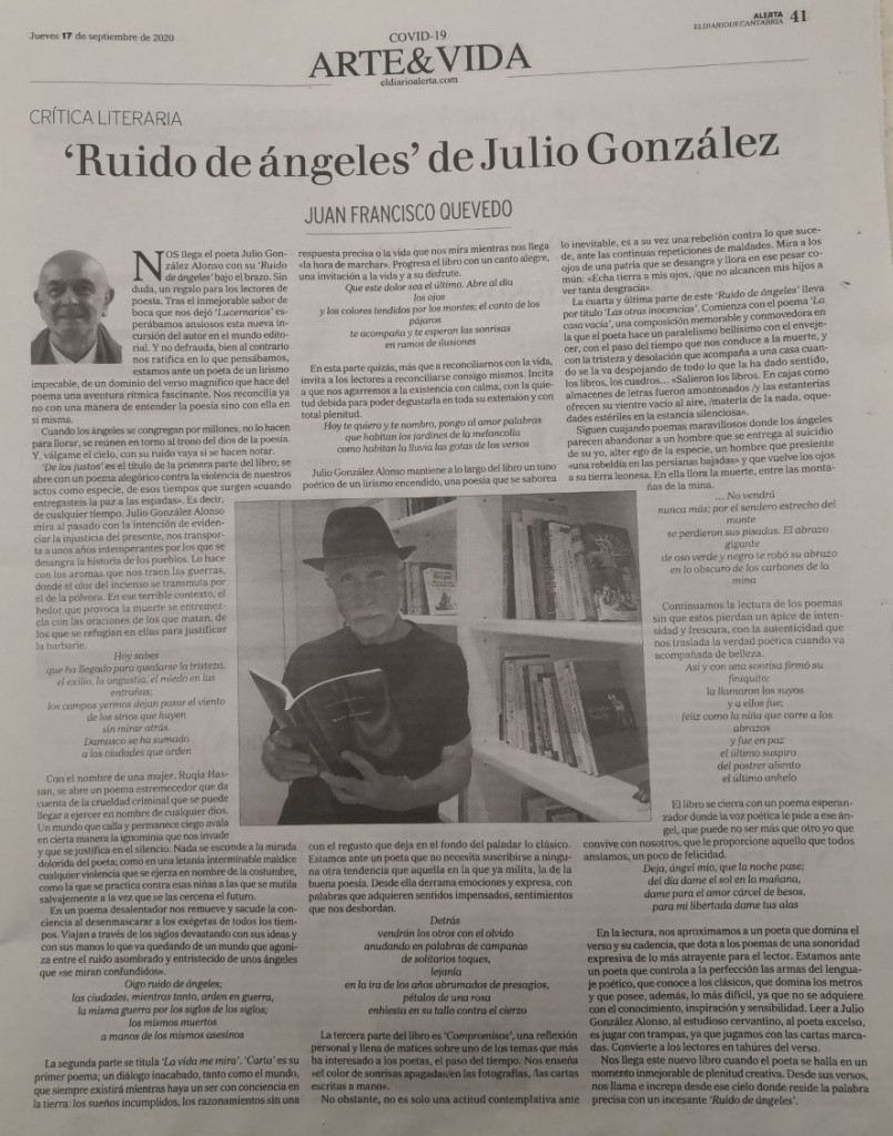 El poemario de Julio González Alonso, titulado Ruido de ángeles, editorial Vitruvio, 2020, es un libro que, por su valor poético, está llamando la atención sobre sus versos. El volumen comprende una colección de 70 poemas, estructurados, ordenados y distribuidos en 4 rúbricas, a saber: 1. De los justos (15 poemas); 2. La vida me mira (19 poemas); 3. Compromisos (19 poemas); y, 4. Las otras inocencias (17 poemas). Anotemos, de paso, que otros libros del poeta son Testimonio de la desnudez y Lucernarios. Una parte de su poesía la conocemos en este foro desde 2007, si no me equivoco, cuando empezó a publicar poemas sueltos en este Rincón Literario, que hoy prestigia con 52 de su autoría, algunos de los cuales, cuatro, aparecen incluidos en el libro Ruido de ángeles.