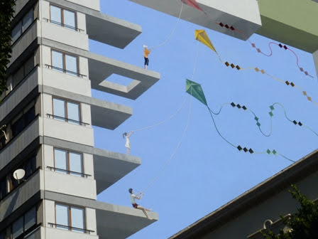 La ciudad almeriense siempre nos aguarda con alguna agradable sorpresa. En el paseo de sus céntricas calles puedes toparte con soluciones imaginativas a las meteduras de pata urbanísticas, como levantar edificios de alturas desproporcionadas en relación a sus colindantes. Las enormes paredes lisas, sin vida ni color, pueden convertirse por medio del arte en sensaciones de aire, movimiento, frescura y libertad. Así, en el Paseo de Almería, casi en su arranque, un inmueble bastante anodino se convierte, por efecto del diseño y la pintura, en una atractiva y leve construcción en la que vuelan las cometas desde plataformas o terrazas pintadas sobre las que se mueven las personas que las manejan. La sensación es la de que el edifico está hueco y puedes ver el cielo a través de ese hueco pintado sobre la pared. Más adelante, en una calle lateral, hay otra propuesta similar. Dos grandes aciertos.