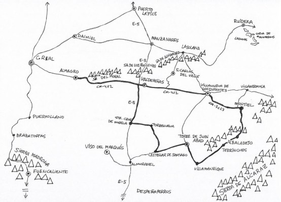 Así, en esta oportunidad, partiendo de Almagro y pasando sin detenernos por Valdepeñas, llegamos a Villanueva de los Infantes para seguir por Montiel, Albaladejo, Torre de Juan Abad, Castellar de Santiago, Terrinches, Torrenueva, Sta. Cruz de Mudela y volver –también sin entrar en Valdepeñas- a Almagro.
