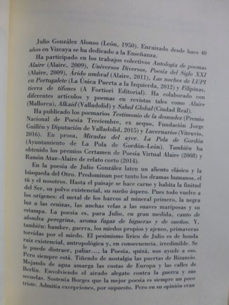 Todos ellos, al decir del prologuista y como puede comprobarse tras la lectura de sus textos, pulcros y cuidadosos con el lenguaje y la corrección dentro del género poético, sin descuidos ni arbitrariedades gratuitas, como quien sabe y ama la herramienta con la que trabaja, la cuida, mima y enriquece, pues el idioma es nuestro patrimonio y obligación del poeta enriquecerlo y ampliarlo para que, cada vez más, abarque mayor número de expresiones capaces de comunicar la belleza y adentrarse en los recovecos del alma, las sensaciones y las emociones. Y no va más.