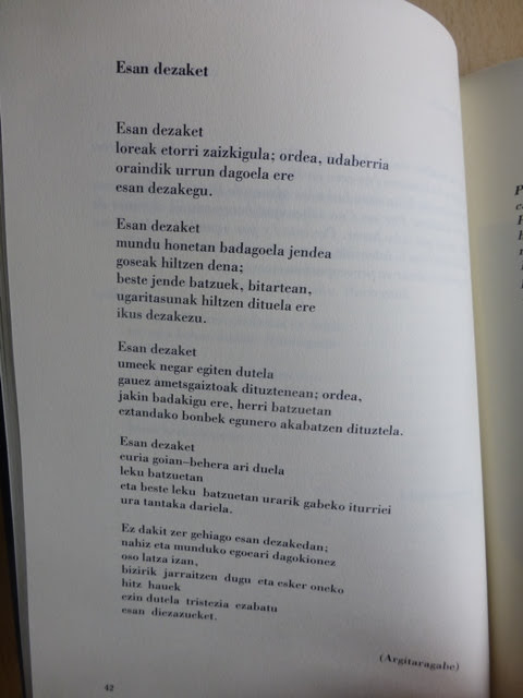 Como explica muy bien el antologista, Alberto Infante, cualquier antología no puede pretender ser exhaustiva y necesariamente se han de echar en falta algunas ausencias; pero la premisa de la calidad literaria debe ser exigida a los que están para que, además de estar, sean. Y en ese sentido, sin recurrir a la falsa modestia, puedo decir que el listón ha sido alto. Siempre cabe otra antología, que en esto nunca está de más abundar en lo bueno. Y es muy probable que venga, dada la animación poética de los últimos años en el ambiente de Bilbao.
