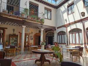 El buen gusto del inmueble tradicional se completa con el mobiliario. Según nos contó el dueño, esta casa y la de enfrente sirvieron para el rodaje de la película “Volver”, de Pedro Almodóvar. Al parecer él mismo consiguió para el rodaje dos camiones de muebles y objetos decorativos, muchos de los cuales forman parte ahora del mobiliario del hotel. También quiso contarnos cómo adquirió la casa una vez terminada la película y cómo Pedro Almodóvar tuvo la intención de comprar la de enfrente para hacer una Escuela de Cine. Al parecer, cuando cuando el propio Almodóvar, el Delegado de Cultura del gobierno manchego, el alcalde y otras autoridades se reunieron con el dueño de la casa, éste dobló el precio inicial de la venta sin avenirse a negociarlo. Como argumento para mantenerse en pedir el doble de lo estimado, el paisano le dijo a Almodóvar: Es que tú eres muy rico, a lo que el director de cine manchego no dudó en responder: Soy muy rico, pero no gilipollas. Y ahí terminó el proyecto de la Escuela de Cine de Almagro. Hoy día, el caserón presenta un estado ruinoso, protegido con una malla por el peligro de derrumbe y hundiéndose parcialmente el tejado, por lo cual se está perdiendo gran parte de su valor histórico y cultural. El dueño no puede hacer reformas si el permiso de Patrimonio Artístico al haber sido declarado de interés cultural, y tampoco atiende a su mantenimiento. La historia, en fin, de la avaricia y tozudez pueblerina que se volvió contra el avaricioso y privó a Almagro de un reseñable y atractivo proyecto cultural, así como de los beneficios que hubiese generado para la ciudad.